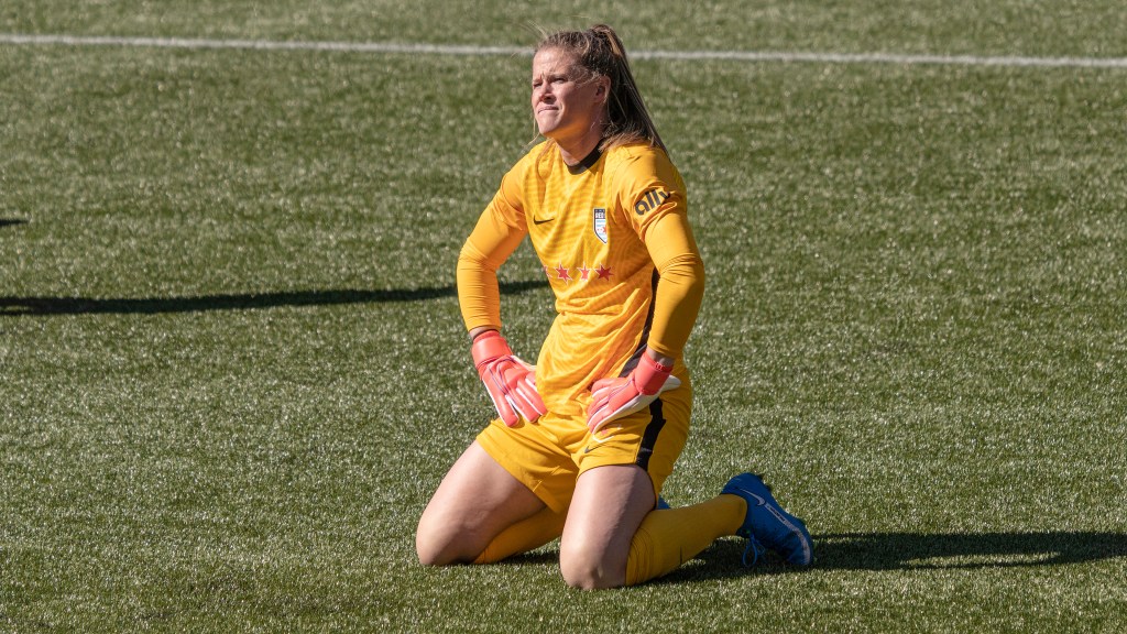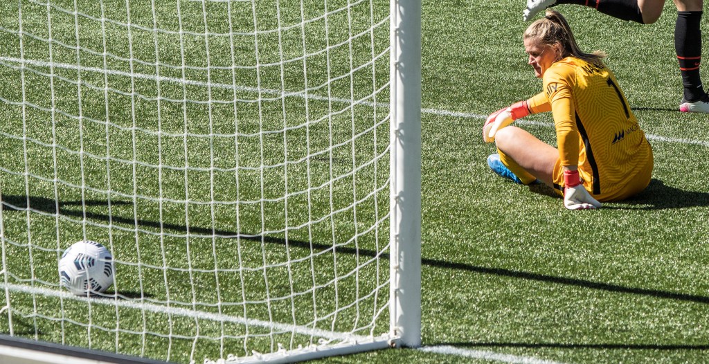 US Team World Cup goalie Alyssa Naeher cannot believe her team is down 0-4 (Photo by Jeff Wong/Honeyball Soccer)