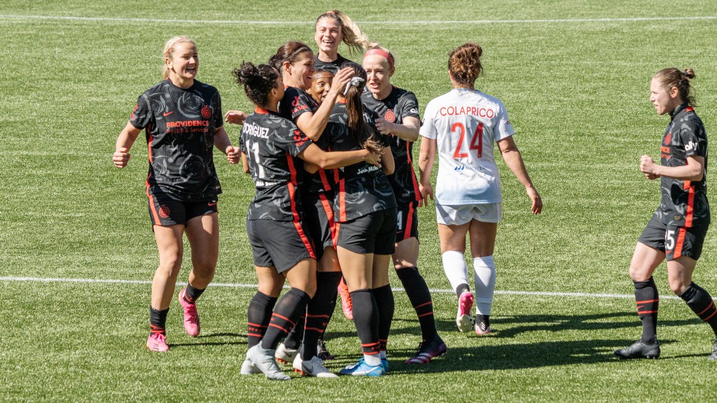 The Thorns Celebrate an Early Lead (Photo by Jeff Wong/Honeyball Soccer)