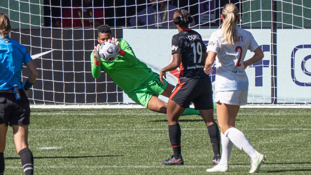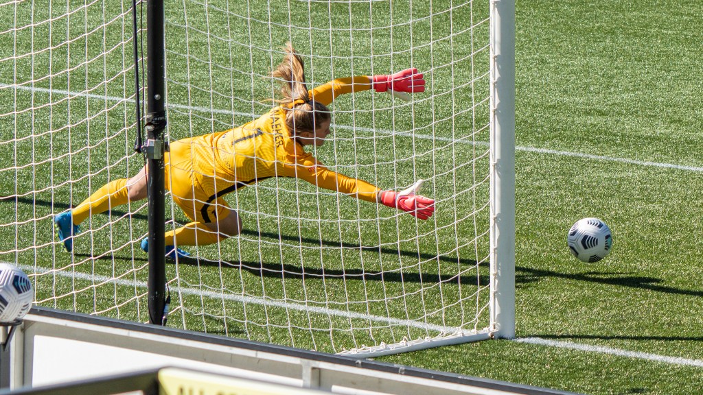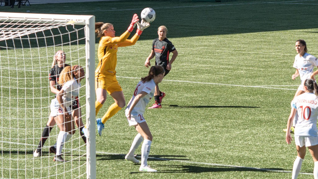 Alyssa Naher snatches the cross out of the air (Photo by Jeff Wong/Honeyball Soccer)