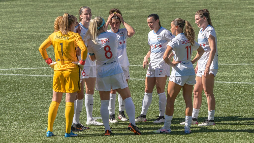 The Red Stars huddle over an early two goal deficit to the Thorns (Photo by Jeff Wong/Honeyball Soccer)