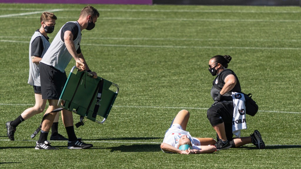 The medical team brings out the stretcher for Julie Ertz (Photo by Jeff Wong/Honeyball Soccer)