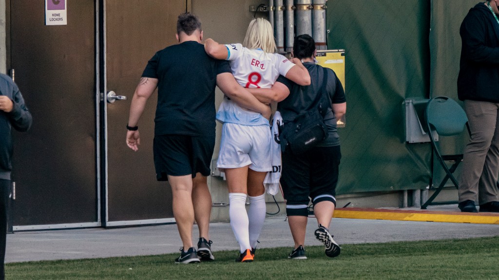 Julie Ertz makes it to the locker room with some help (Photo by Jeff Wong/Honeyball Soccer)