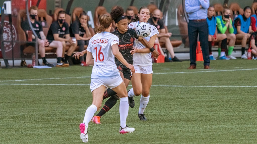 Sophia Smith and Tierna Davidson watch Casey Kruger take a header (Photo by Jeff Wong/Honeyball Soccer)