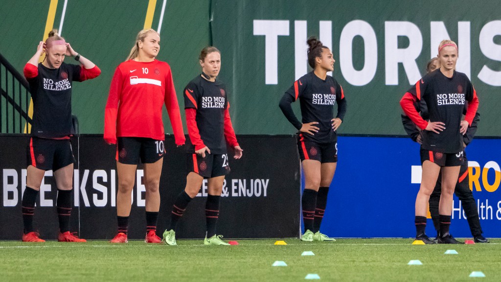 Most of the Thorns, who were coached by Paul Riley between 2013 and 2015, wore jerseys saying “No More Silence” in warmups before the Portland Thorns’ 2-3 loss to the Houston Dash in Providence Park, Portland, Oregon, on October 6, 2021 (photo by Jeff Wong).