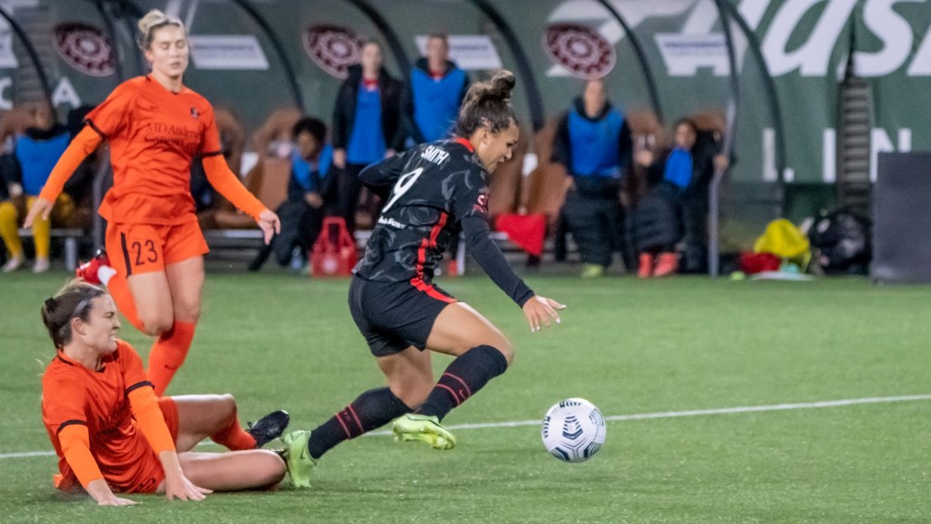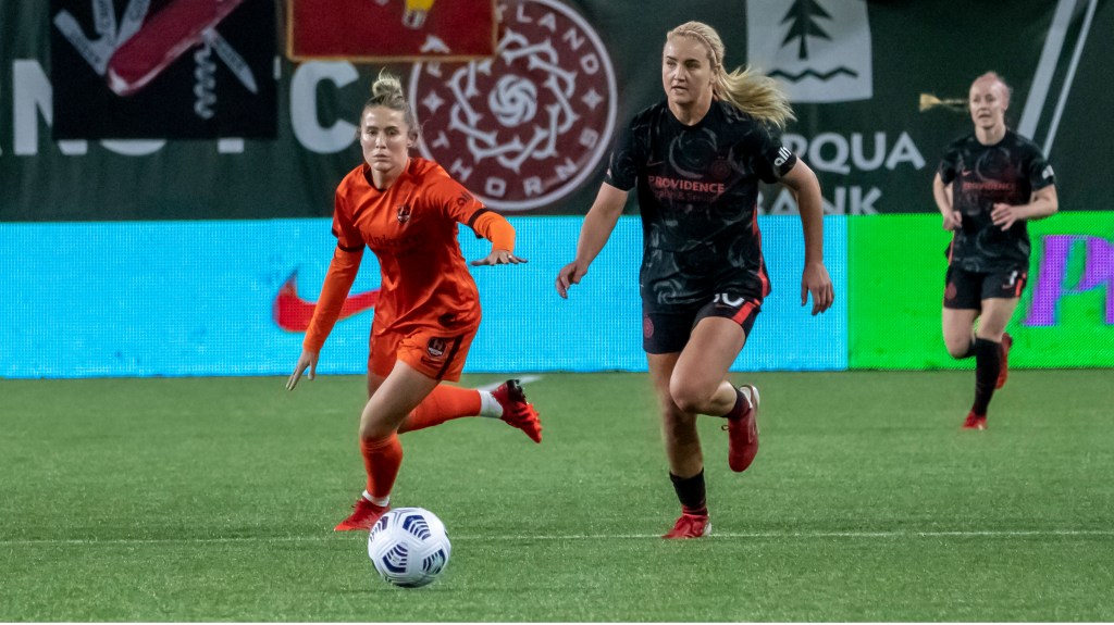 Portland’s Sophia Smith looks for clearance against Houston’s Haley Hanson in the Portland Thorns’ 2-3 loss to the Houston Dash in Providence Park, Portland, Oregon, on October 6, 2021 (photo by Jeff Wong).