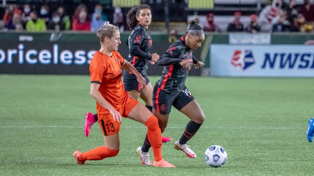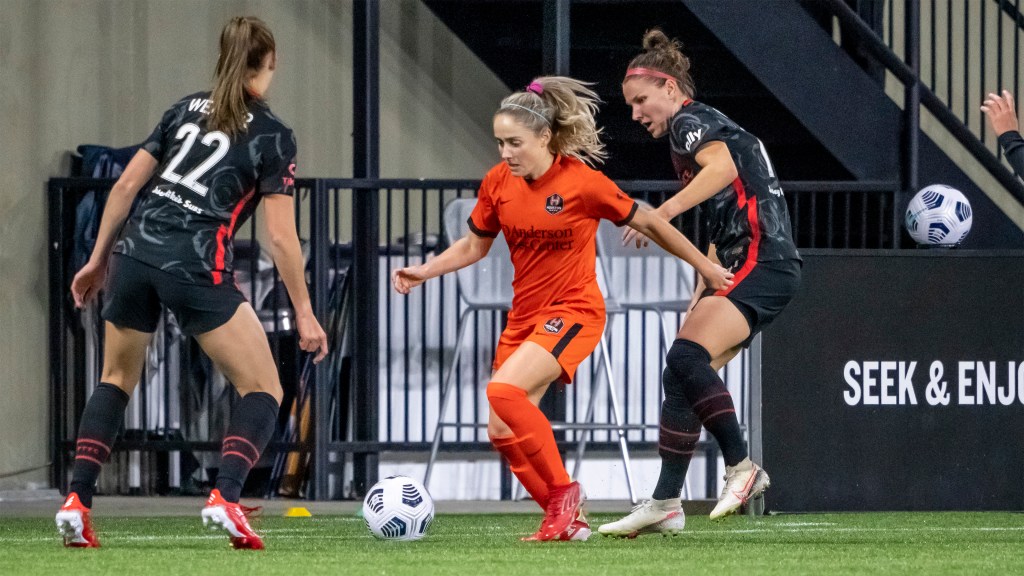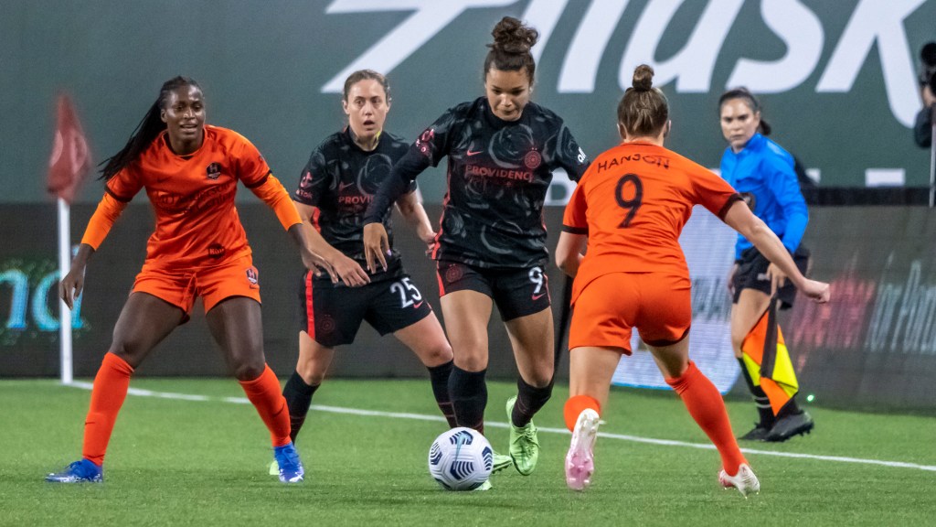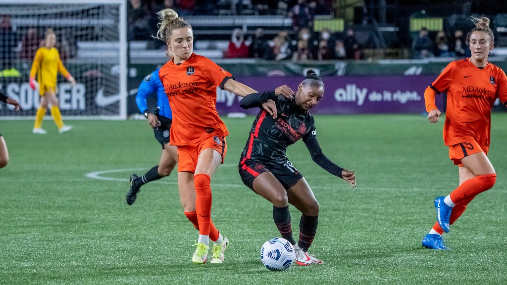 Houston’s Bri Visalli works against the Portland double team of Morgan Weaver and Natalia Kuikka in the Portland Thorns’ 2-3 loss to the Houston Dash in Providence Park, Portland, Oregon, on October 6, 2021 (photo by Jeff Wong).