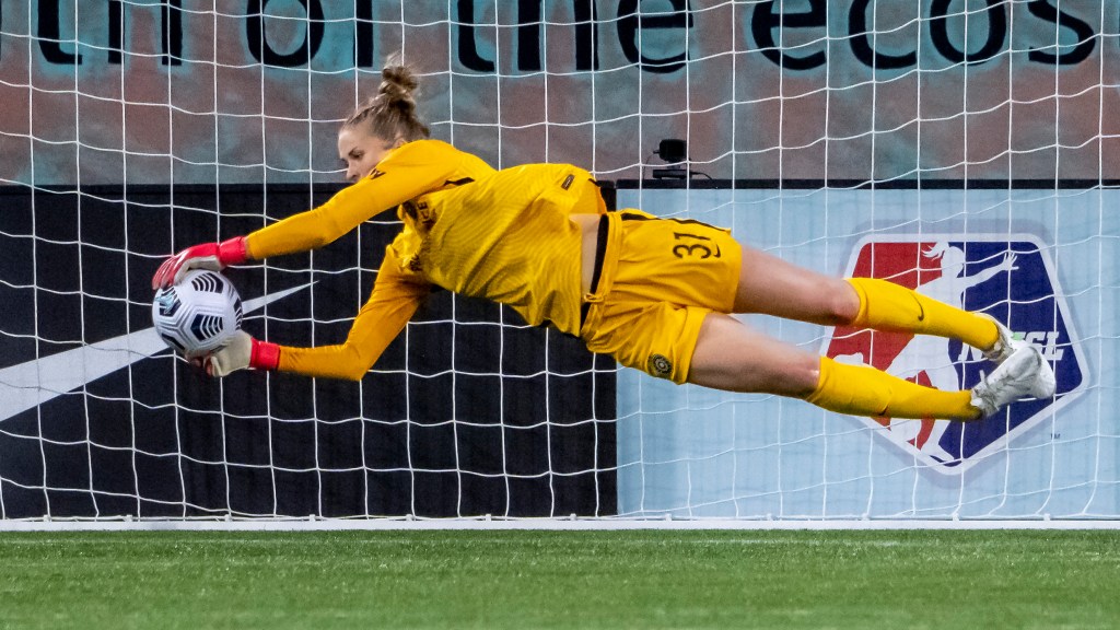 Portland’s goalie Bella Bixby goes horizontal for the save in the Portland Thorns’ 2-3 loss to the Houston Dash in Providence Park, Portland, Oregon, on October 6, 2021 (photo by Jeff Wong).