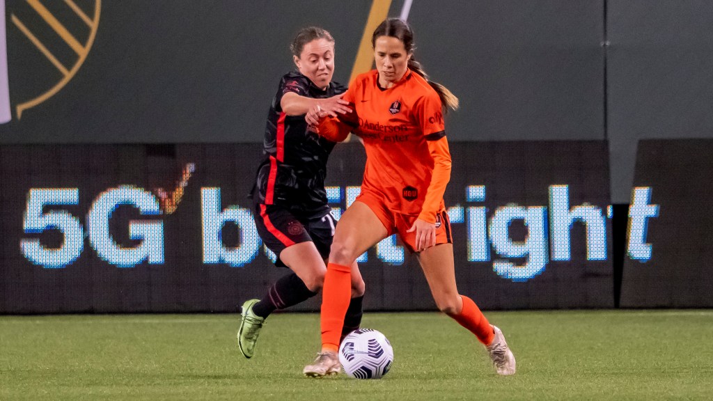 Houston’s Gabby Seiler struggles to contain Portland’s Olympic star Lynsey Horan in the Portland Thorns’ 2-3 loss to the Houston Dash in Providence Park, Portland, Oregon, on October 6, 2021 (photo by Jeff Wong).
