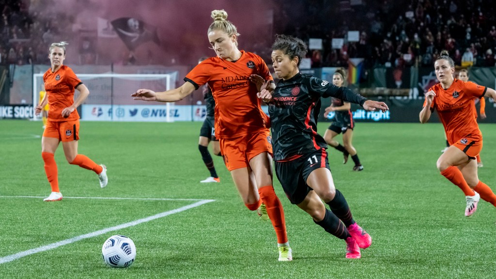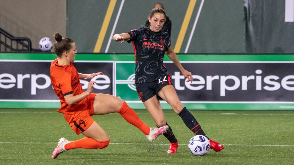 Houston’s Olympic star Kristie Mewis and Portland’s Rocky Rodriguez battle for possession in the Portland Thorns’ 2-3 loss to the Houston Dash in Providence Park, Portland, Oregon, on October 6, 2021 (photo by Jeff Wong).