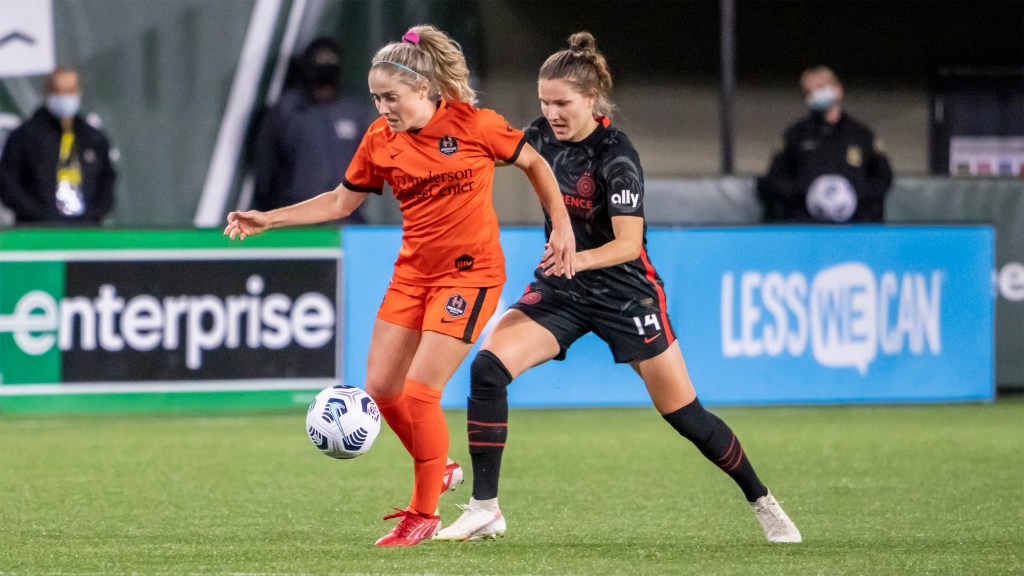 Portland’s Rocky Rodriguez wards off Houston’s Haley Hanson in the Portland Thorns’ 2-3 loss to the Houston Dash in Providence Park, Portland, Oregon, on October 6, 2021 (photo by Jeff Wong).