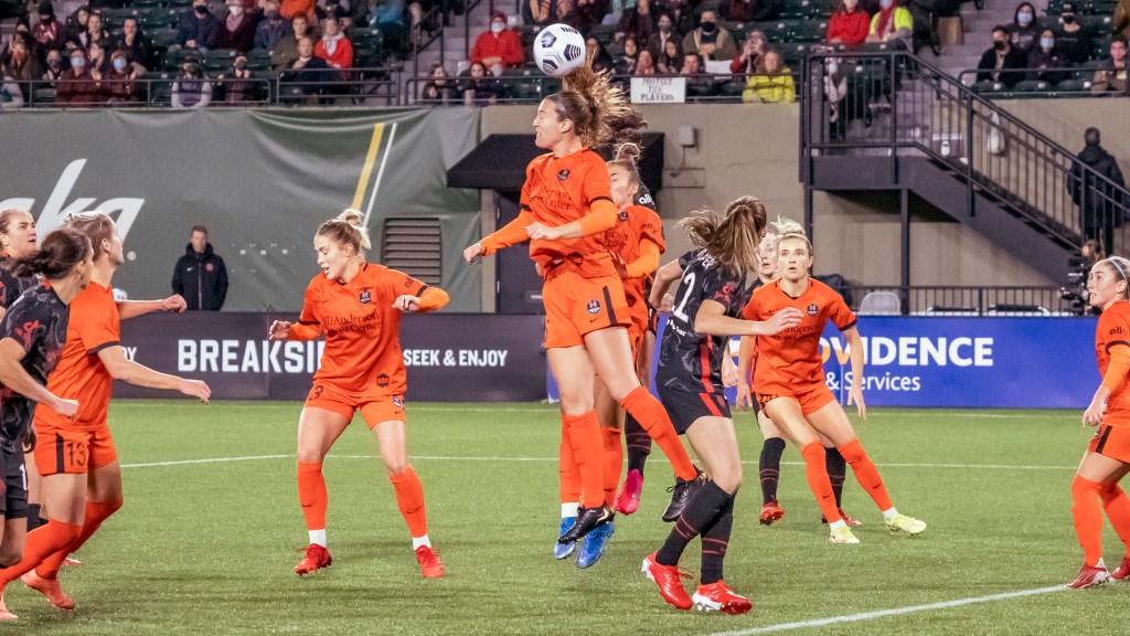 Houston’s Katie Naughton clears Portland’s corner kick in the Portland Thorns’ 2-3 loss to the Houston Dash in Providence Park, Portland, Oregon, on October 6, 2021 (photo by Jeff Wong).