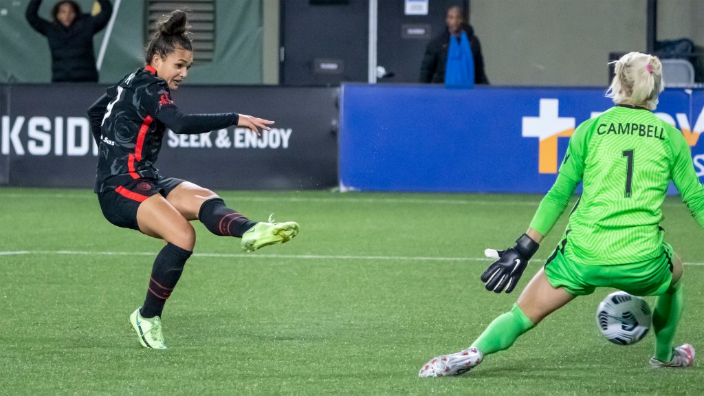 Portland’s Sophia Smith nutmegs Houston’s goalie Jane Campbell and scores an equalizing goal in the Portland Thorns’ 2-3 loss to the Houston Dash in Providence Park, Portland, Oregon, on October 6, 2021 (photo by Jeff Wong).