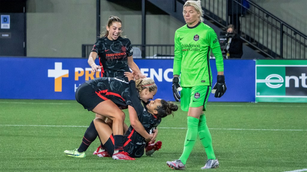 Portland’s Morgan Weaver, Lynsey Horan, and Sophia Smith celebrate Smith’s nutmeg goal in front of Houston’s goalie, Jane Campbell, in the Portland Thorns’ 2-3 loss to the Houston Dash in Providence Park, Portland, Oregon, on October 6, 2021 (photo by Jeff Wong).