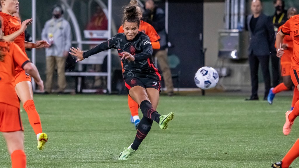 Portland’s Sophia Smith finds clearance and shoots for the goal again but misses in the Portland Thorns’ 2-3 loss to the Houston Dash in Providence Park, Portland, Oregon, on October 6, 2021 (photo by Jeff Wong).