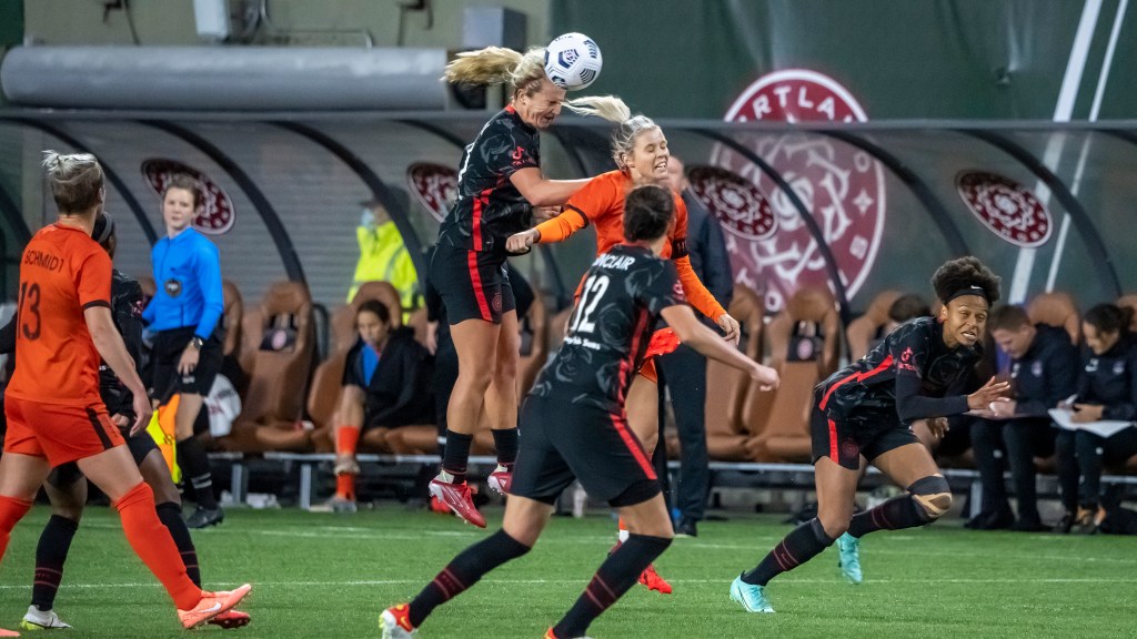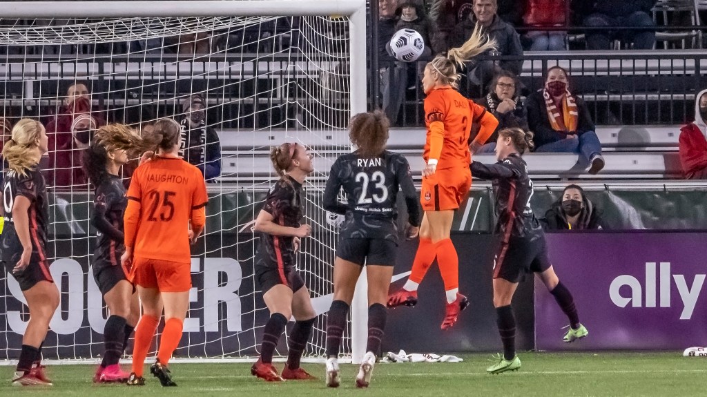 Houston’s Rachel Daly, the captain of the English Olympic Team, clinches the win for Houston with this header in the Portland Thorns’ 2-3 loss to the Houston Dash in Providence Park, Portland, Oregon, on October 6, 2021 (photo by Jeff Wong).