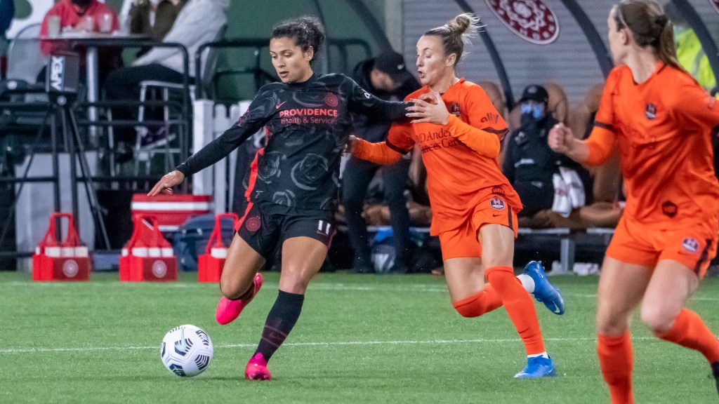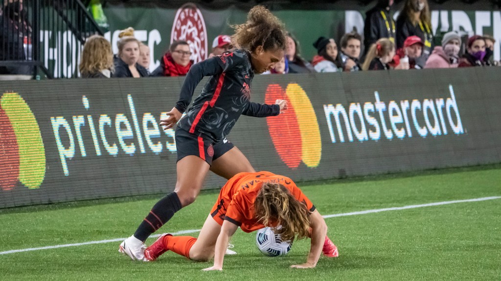 Portland’s Rocky Rodgriguez brings down the high ball in the Portland Thorns’ 2-3 loss to the Houston Dash in Providence Park, Portland, Oregon, on October 6, 2021 (photo by Jeff Wong).