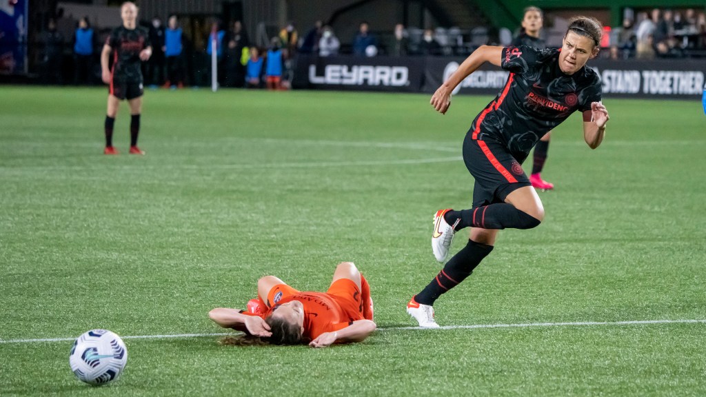 Alyssha Chapman gets the worst of a no foul collision with Olympic Gold Medalist Christine Sinclair in the Portland Thorns’ 2-3 loss to the Houston Dash in Providence Park, Portland, Oregon, on October 6, 2021 (photo by Jeff Wong).