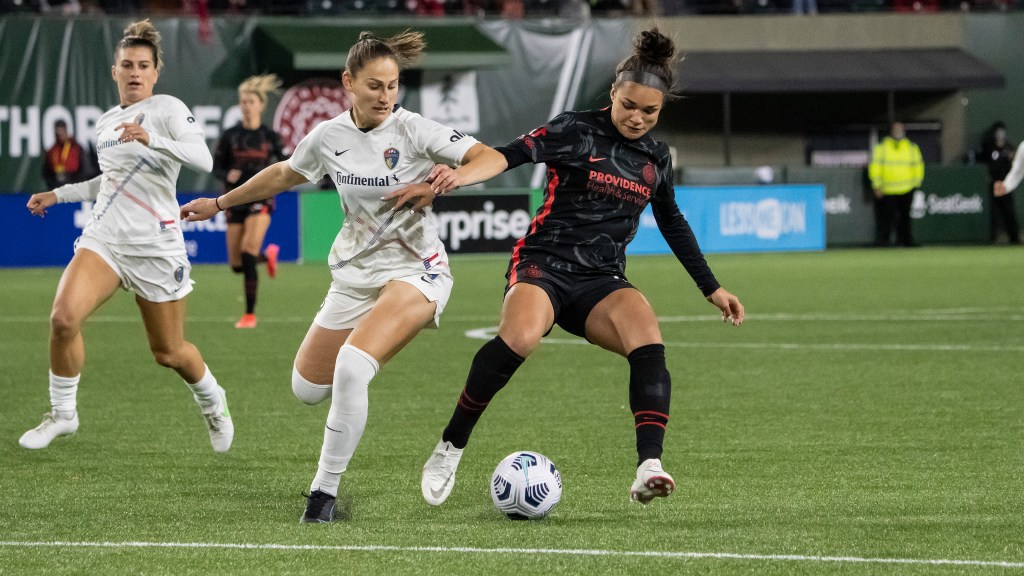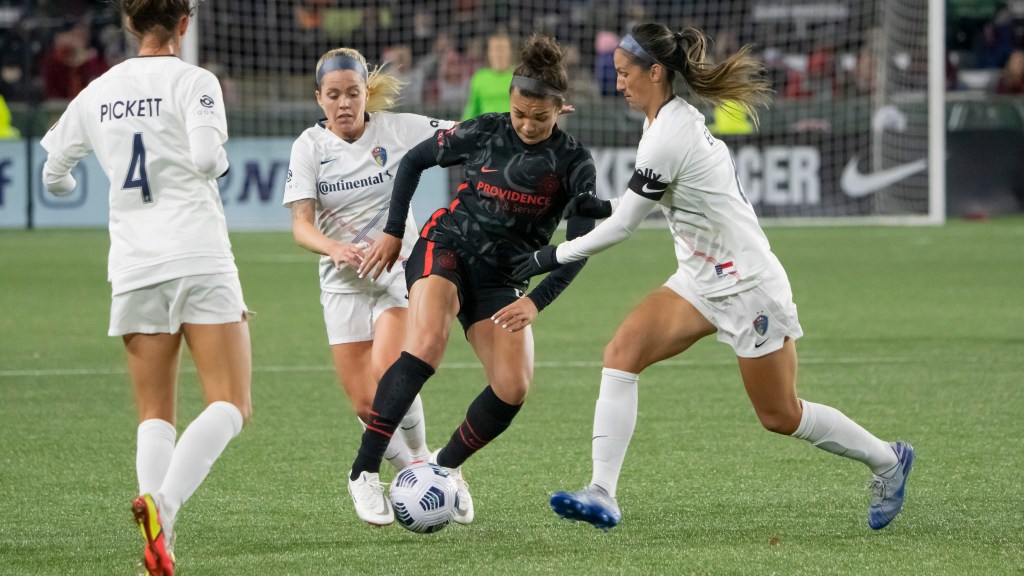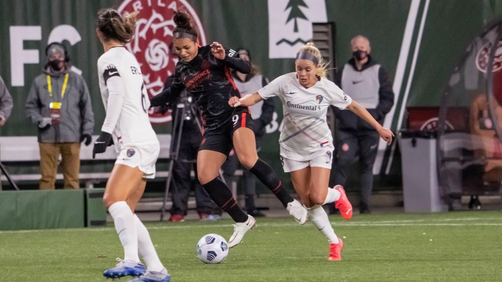 Thorns forward Sophia Smith gets sandwiched between the Courage double team of Denise O’Sullivan and Abby Erceg in the 0-0 draw between the Portland Thorns and North Carolina Courage in Providence Park, Portland, Oregon, on October 30, 2021 (Photo by Jeff Wong).