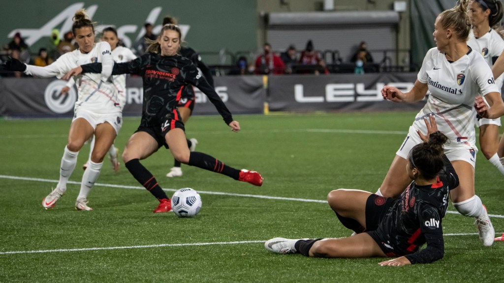 Thorns Sophia Smith passes to Thorns Morgan Weaver as Smith falls and Weaver takes a shot while held by Carson Pickett in the 0-0 draw between the Portland Thorns and North Carolina Courage in Providence Park, Portland, Oregon, on October 30, 2021 (Photo by Jeff Wong).
