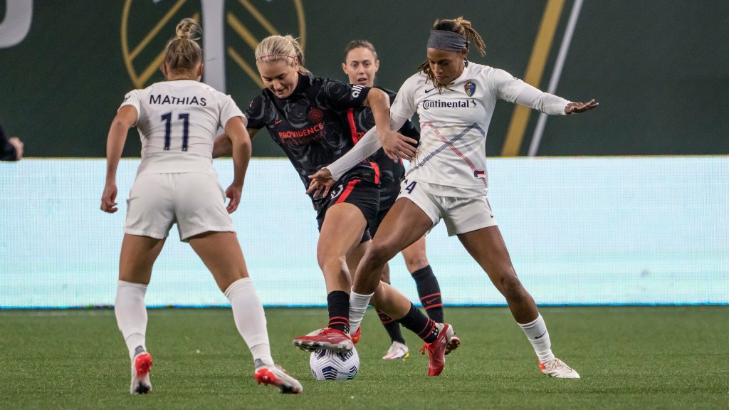 Courage Lynn Williams tries to dribble through the Thorns double team of Emily Menges and Yasmeen Ryan in the 0-0 draw between the Portland Thorns and North Carolina Courage in Providence Park, Portland, Oregon, on October 30, 2021 (Photo by Jeff Wong).