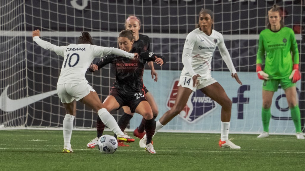 Thorns Megan Klingenberg and Becky Sauerbrunn defend against Courage Debinha and Jessica MacDonald in the Thorn’s box in the 0-0 draw between the Portland Thorns and North Carolina Courage in Providence Park, Portland, Oregon, on October 30, 2021 (Photo by Jeff Wong).