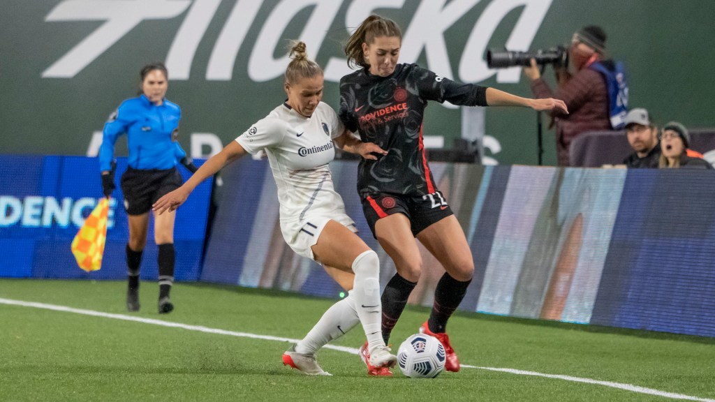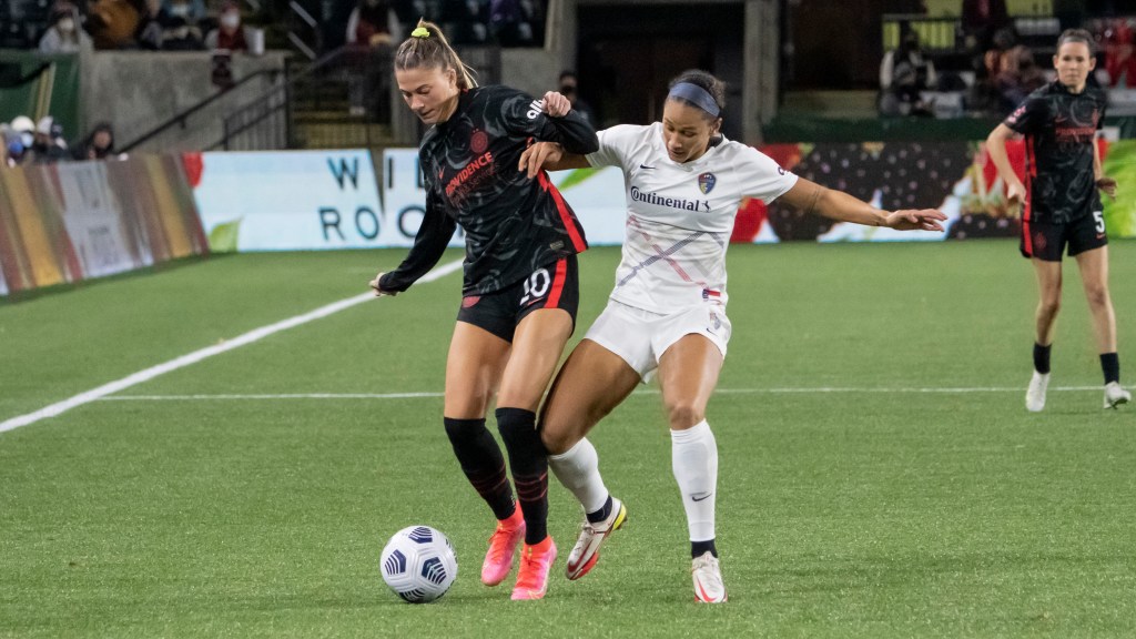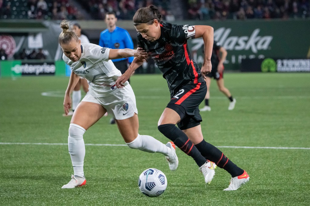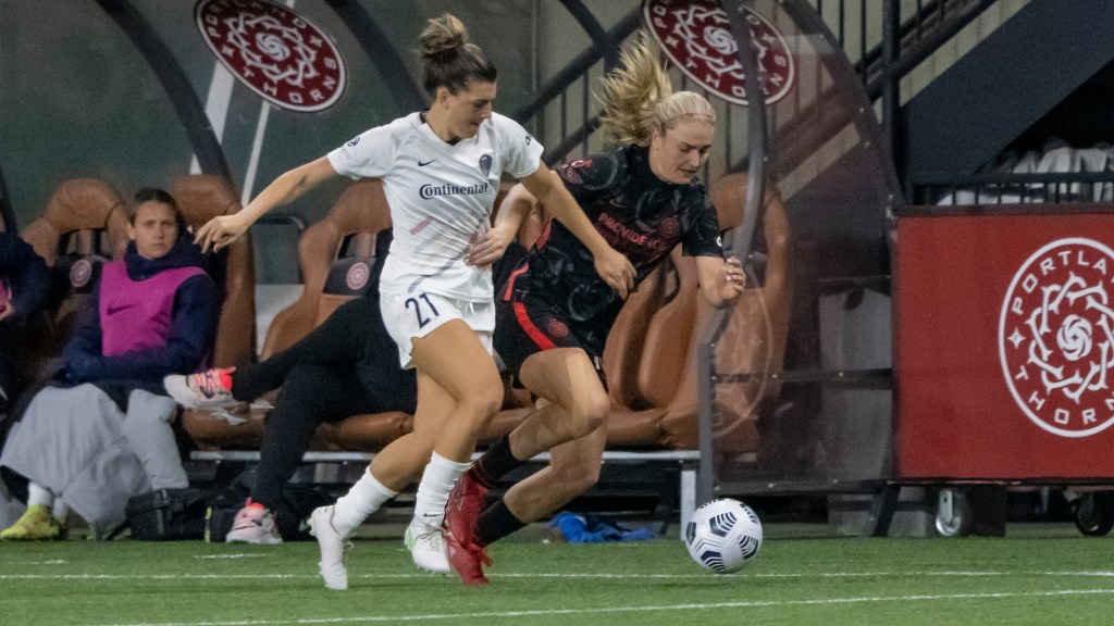 Courage Cari Roccaro and Thorns Lindsey Horan battle for possession in the 0-0 draw between the Portland Thorns and North Carolina Courage in Providence Park, Portland, Oregon, on October 30, 2021 (Photo by Jeff Wong).
