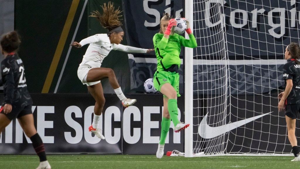 Thorns goalie Bella Bixby grabs the high cross before Courage forward Jessica MacDonald can get her head on it in the 0-0 draw between the Portland Thorns and North Carolina Courage in Providence Park, Portland, Oregon, on October 30, 2021 (Photo by Jeff Wong).