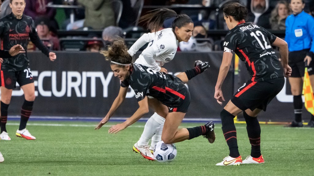 Courage Debinha hooks Thorns Angela Salem’s leg and sends Salem to the ground in the 0-0 draw between the Portland Thorns and North Carolina Courage in Providence Park, Portland, Oregon, on October 30, 2021 (Photo by Jeff Wong).