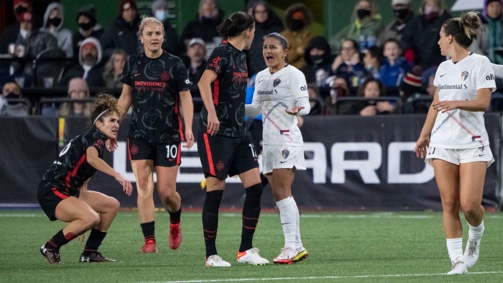 Thorns Christine Sinclair, an Olympic gold medalist from Canada, and Courage Debinha have words after Debinha fouls Thorns Angela Salem with a leg hook in the 0-0 draw between the Portland Thorns and North Carolina Courage in Providence Park, Portland, Oregon, on October 30, 2021 (Photo by Jeff Wong).