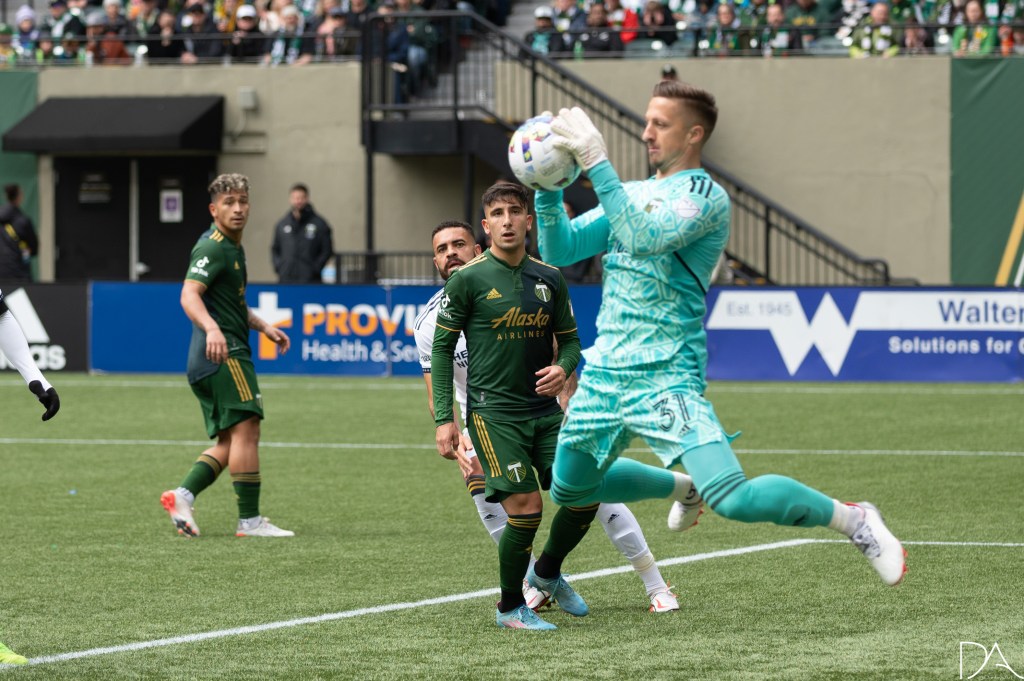 Claudio Bravo (5 Portland Timbers) watching Aljaz Ivacic (31 Portland Timbers) make a save during the Major League Soccer game between Portland Timbers v LA Galaxy at Providence Park in Portland, Oregon.Samuel Grandsir (11 LA Galaxy) assist to an own goal during the Major League Soccer game between Portland Timbers v LA Galaxy at Providence Park in Portland, Oregon.Kévin Cabral (9 LA Galaxy)