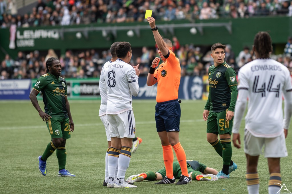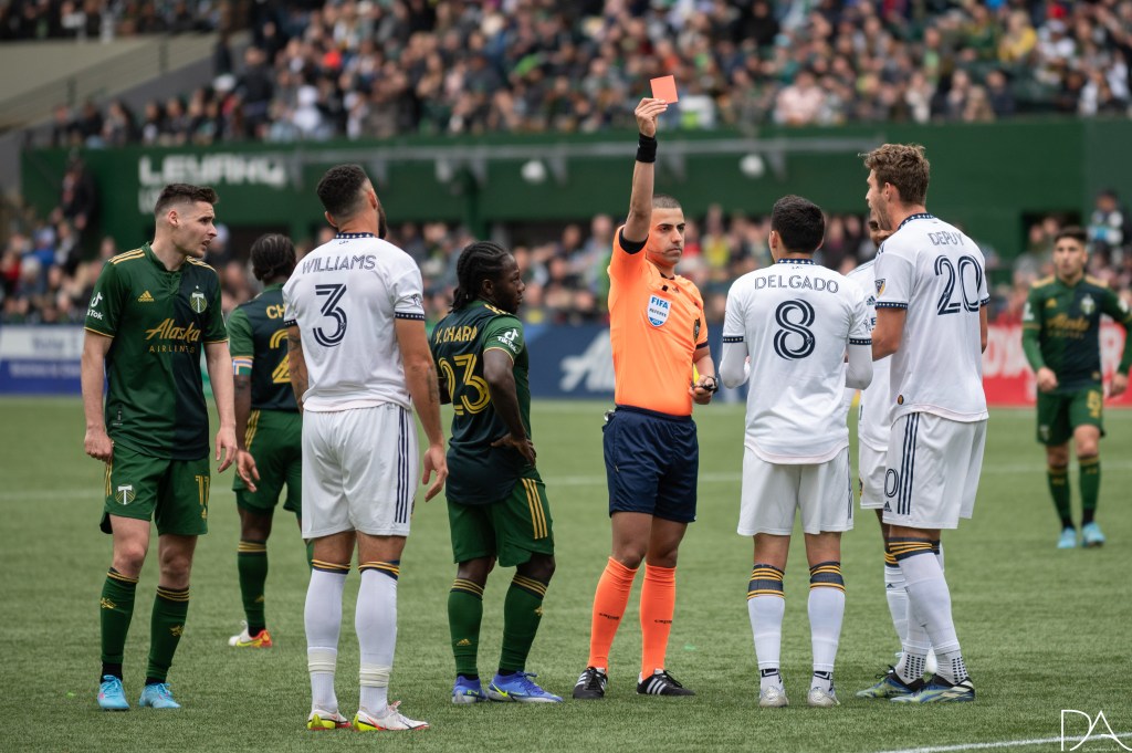 Red would be seen by both sides in match. First to be sent off the pitch was Portland’s Pablo Bonilla in first half stoppage time for an elbow to the face. The second would be Marco Delgado of the Galaxy after getting his second yellow in the 61st.