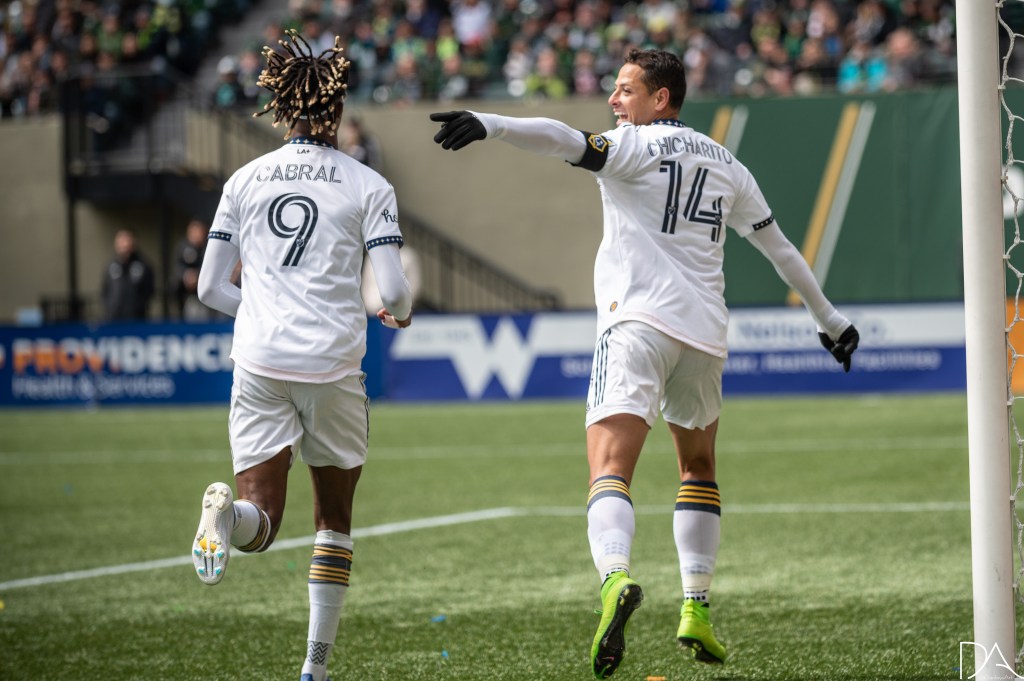 against Claudio Bravo (5 Portland Timbers) during the Major League Soccer game between Portland Timbers v LA Galaxy at Providence Park in Portland, Oregon.Javier Hernández (14 LA Galaxy) against Timbers defense during the Major League Soccer game between Portland Timbers v LA Galaxy at Providence Park in Portland, Oregon.Javier Hernández (14 LA Galaxy) celebratingduring the Major League Soccer game between Portland Timbers v LA Galaxy at Providence Park in Portland, Oregon.Javier Hernández (14 LA Galaxy) and Kévin Cabral (9 LA Galaxy) during the Major League Soccer game between Portland Timbers v LA Galaxy at Providence Park in Portland, Oregon.Javier Hernández (14 LA Galaxy)